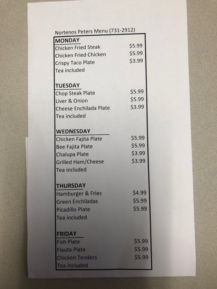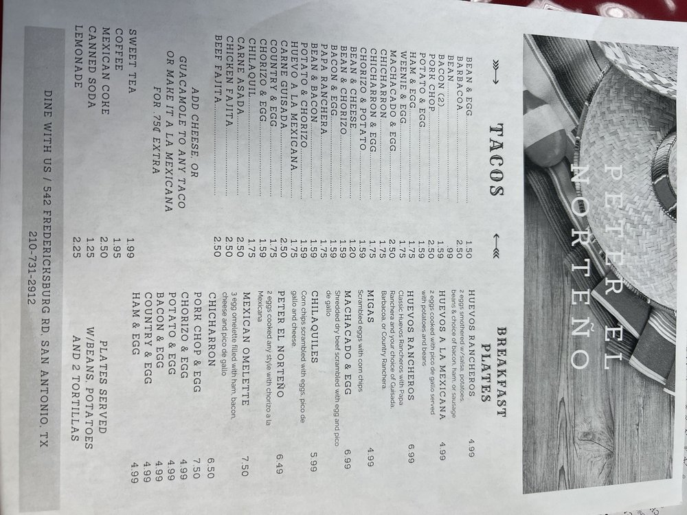 Introducing Peter El Norteno, a hidden gem in San Antonio offering delicious Mexican breakfast and brunch options. This neighborhood spot is known for its affordable prices, friendly service, and consistently tasty food. The chicken fried steak is a standout dish, tender and flavorful with generous portions. Don't miss out on the homemade corn tortillas and mouth-watering breakfast tacos, including chorizo & egg and bean varieties. The daily lunch specials are a hit, offering dishes like chicken strips and flautas for just $5.99. With a cozy dining room and attentive staff, Peter El Norteno is the perfect spot for a hearty meal with friends or family. Plus, they offer catering services for special events. Don't overlook this local favorite for a satisfying and wallet-friendly dining experience.